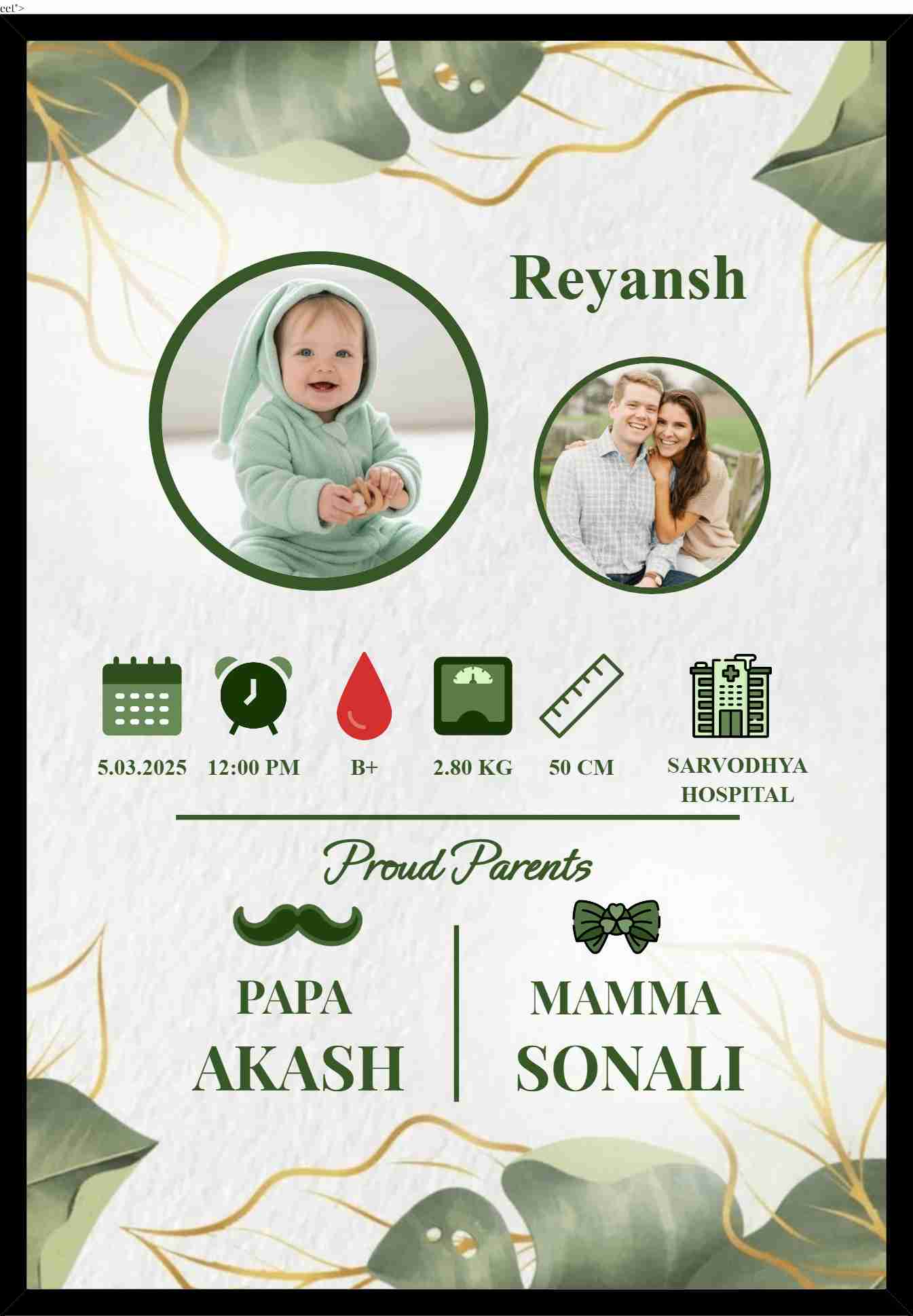 • Complete Birth Details: Add name, date, time, weight, height, blood group & hospital.